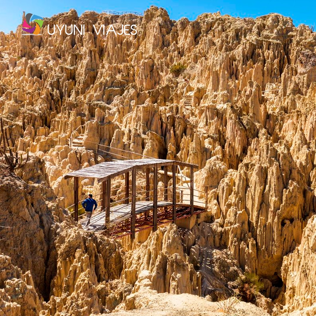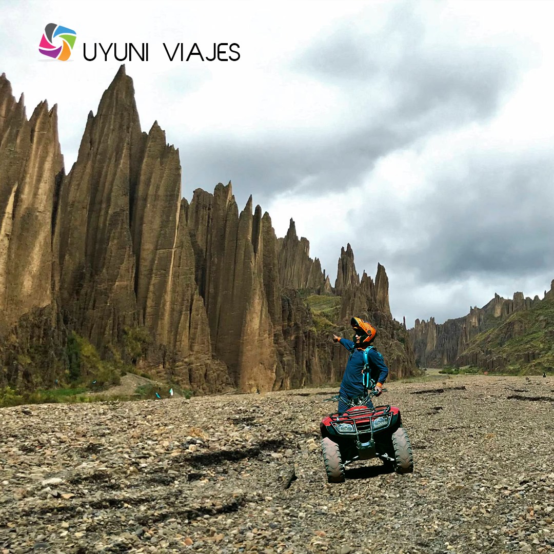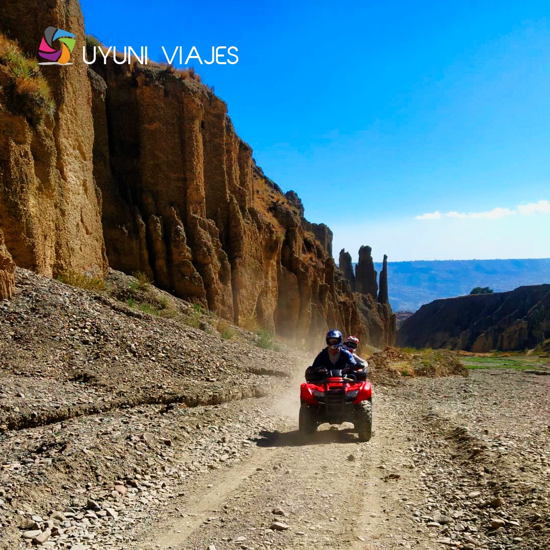 Uyuni viajes te acompañara a realizar este tour y sumergir en la serenidad del valle de la luna que un paisaje único a las puertas de la Paz Bolivia. Ven a caminar entre sus formaciones rocosas y disfrutar de la adrenalina de una aventura en el entorno de valle de la luna, Cañón de palca y Muela del diablo en cuadratrack.